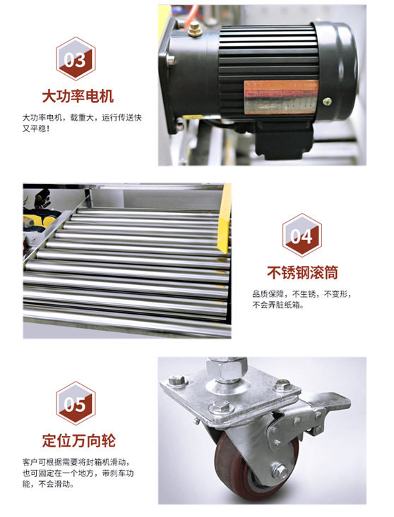 角邊封箱機紙箱經(jīng)前段封箱機中間上下封口后,進入90度轉角機,由推箱板推入角邊封箱機,同時自動封紙箱上下四個角邊、撫平,快速、平穩(wěn)。